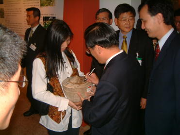 達文西瓜藝文館老闆娘半路殺出請總統在陀螺上簽名,隨即大叫要和總統照相, 總統欣然接受.