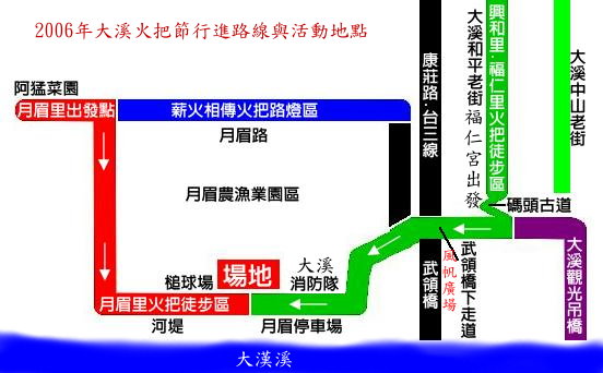 日期:2006年2月11日(農曆1月13日、星期六)下午18:00至下午21:00 地點:大溪鎮月眉河濱公園河堤。
