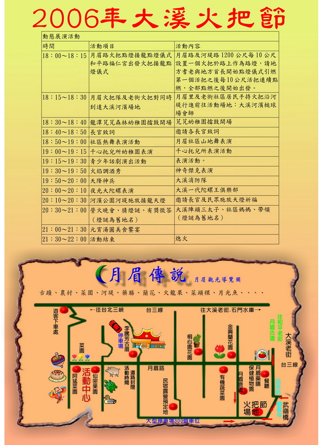 | 18:15∼18:30 | 月眉火把隊及老街火把對同時到達大溪月眉河堤活動場地 | 月眉里及老街社區居民手持火把沿河堤行進前往活動場地:大溪月眉河堤(消防隊廣場) | |||