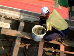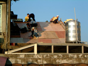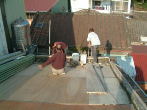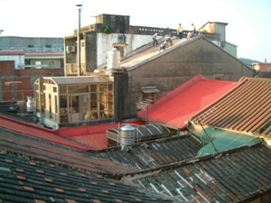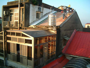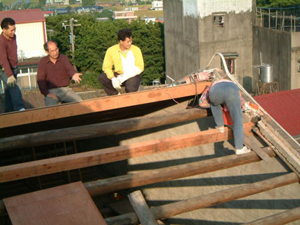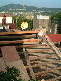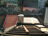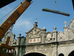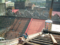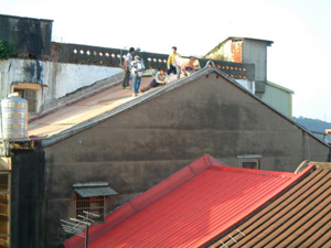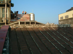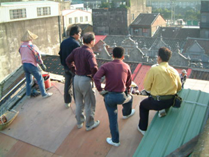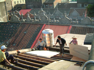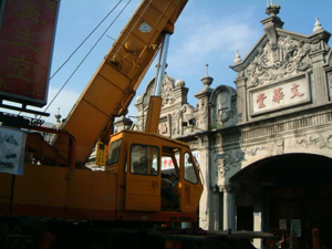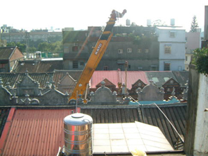 在2001年11月25日的下午,參與了和平路歷史街坊的街屋抽樑換瓦的施工過程,對於一般的現場施工而言並不困難, 但這是在老街上, 稍有閃失就會鑄成大錯,而且由於街屋相當的長,以人力搬運材料到高樓屋頂上幾乎不可能( 除非拆毀牌樓來施工最容易了), 讓我們一同來看看在地的居民是如何完成這樣的工程吧~~