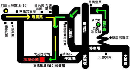 月眉火把隊及老街火把對同時出發 月眉里及老街社區居民手持火把沿河堤行進前往大溪河濱槌球場會師 |