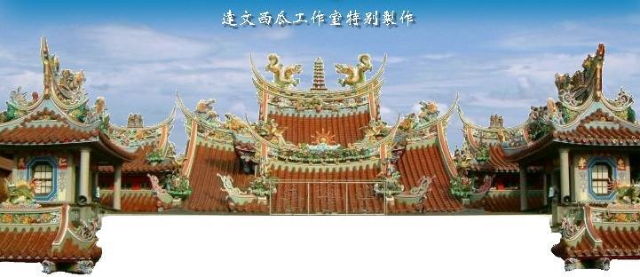 遼闊寬廣之廟埕,置身其中,俯瞰大漢溪的山光水色,令人樂趣橫生、俗勞盡消。本堂採南方建築,前、後簷頂翼角裝飾各式剪黏,祥龍獻瑞、雙鳳含珠、栩栩如生、巧奪天工的瓷片構形,色彩鮮活明亮、瑰麗耀眼,飾以福祿壽三星,象徵其仙遊人間、賜福黎庶之寓意,間或點綴叢林、花鳥、人物各種圖案,手工精巧、細膩,甚具慧思。左右各設一美侖美奐的鐘中樓、鼓樓,分書忠孝、仁愛之字,醒目引人。