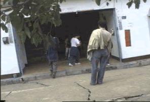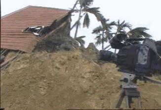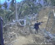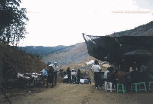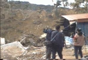 現在這裡四處都飄著飯菜香,卻沒有任何娛快的氣氛,人人都一副淡然表情,只 [甲飯嘍!~卡緊返來甲飯喔~] 柯先生扛著電視攝影機站前去拍攝正在炒菜的婦人,她看也不看,徑自作飯,不像 「某一家少了人.某一家少了小孩」….. 剛才我們在九份二山上來來回回走過的土地上,也許底下正埋著他們的身家 [加油啊!我們都還要再加油啊!!] ………..真教人心頭無比沈重………….